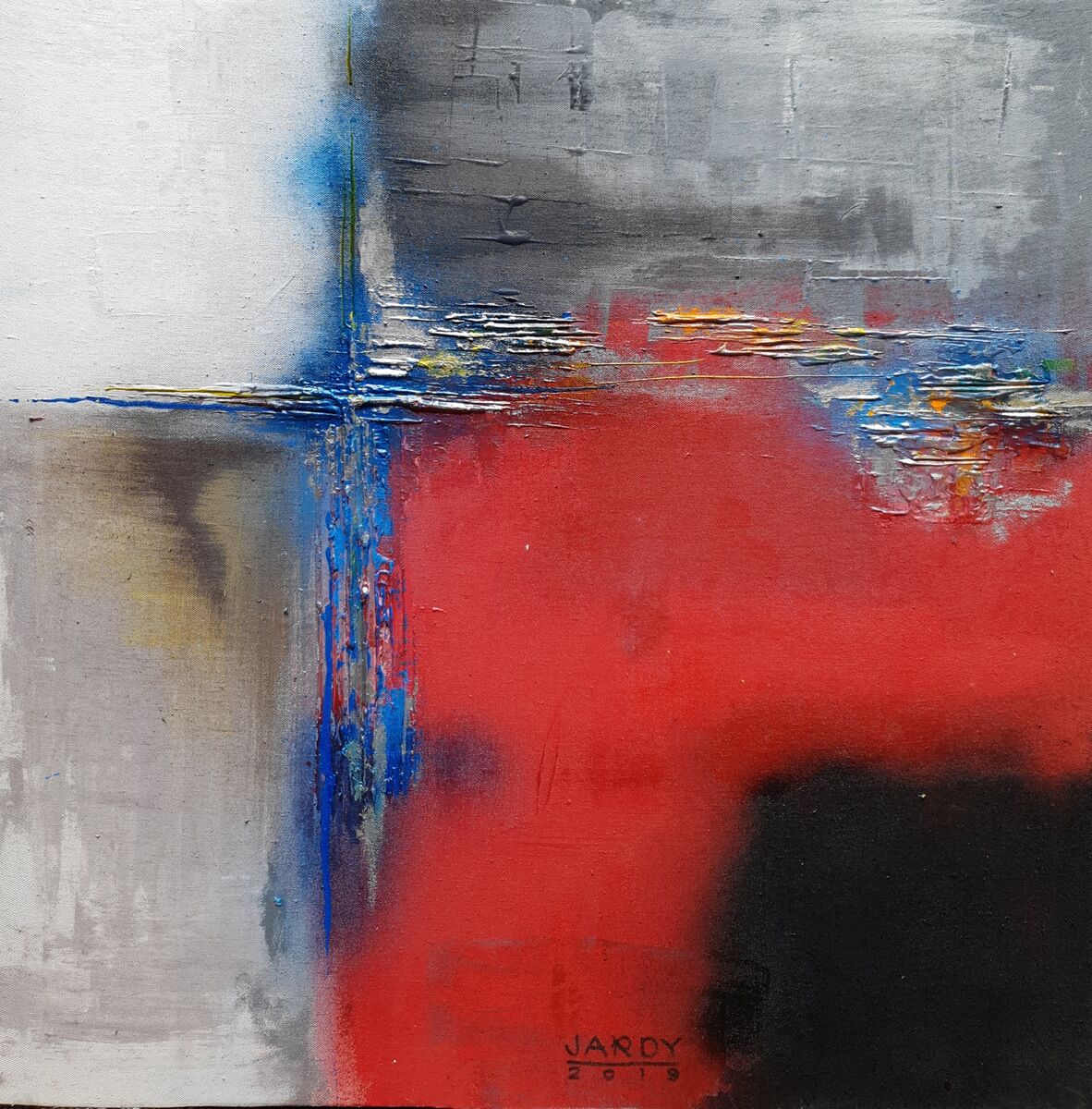 On quadrant this artwork explores relationship of red and black and the feelings with the neutrals with blue as in between. Cold or warm. Joy or sadness. Stillness or motion. Yours to feel.